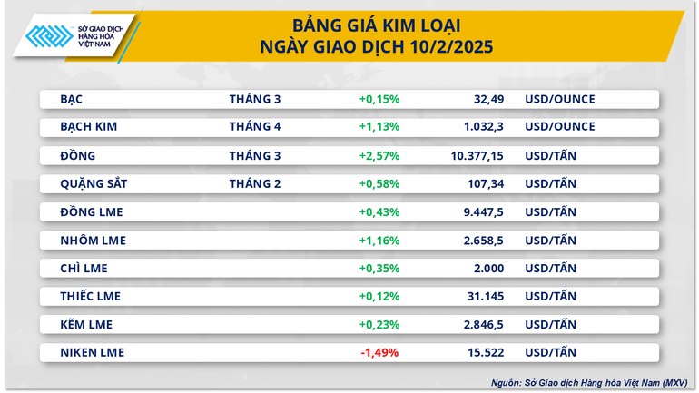 Bên cạnh đó, thị trường kim loại cơ bản cũng được hưởng lợi khi quyết định áp thuế 25% lên thép và nhôm nhập khẩu của ông Trump, được công bố vào cuối tuần trước, chính thức có hiệu lực vào ngày 10/2. Động thái này làm dấy lên lo ngại về tình trạng thắt chặt nguồn cung tại Mỹ, qua đó đẩy giá nhiều mặt hàng kim loại đi lên. Việc chi phí nhập khẩu tăng buộc doanh nghiệp phải tìm kiếm nguồn cung trong nước hoặc từ các thị trường khác với mức giá cao hơn, khiến chi phí sản xuất leo thang.