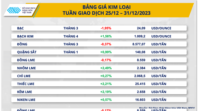 Tuần giao dịch cuối cùng năm 2023 (26-29/12), thị trường hàng hóa nguyên liệu thế giới diễn biến phân hóa về giá. Hầu hết các mặt hàng nhóm kim loại đều tăng giá, trong khi giá nhiều mặt hàng nhóm nông sản, năng lượng lại giảm.