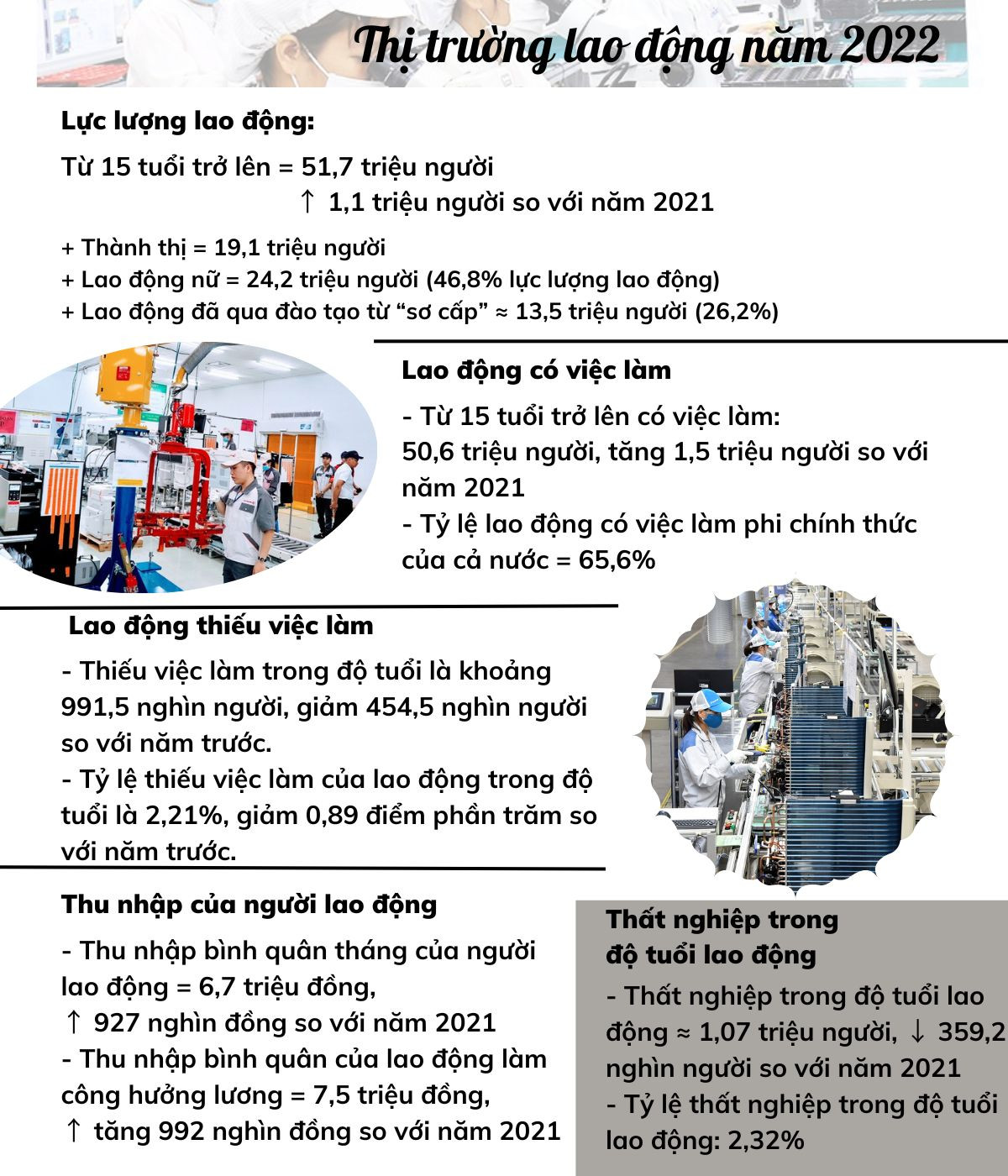 Cho dù tốc độ hồi phục có sự chậm lại trong những tháng cuối năm do tác động từ khủng hoảng đa chiều trên thế giới và những điều chỉnh của thị trường trong nước, phải thẳng thắn nhận định rằng, năm 2022 vẫn là năm hồi phục ấn tượng của thị trường lao động-việc làm của Việt Nam so với năm 2021 và so với cả thời điểm trước dịch năm 2019. Đây vẫn sẽ là bước đà tốt giúp thị trường tiếp tục hồi phục và phát triển trong năm 2023.