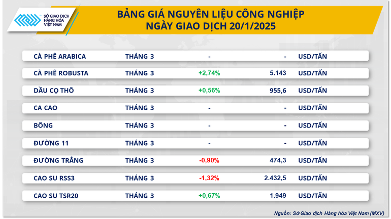 Trong đó, giá cà-phê tiếp tục nối dài đà tăng từ các phiên cuối tuần trước do triển vọng nguồn cung kém lạc quan tại Brazil, quốc gia cung ứng cà-phê lớn nhất thế giới. Đóng cửa, giá cà-phê Robusta tăng 2,74% lên mức 5.143 USD/tấn.