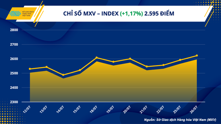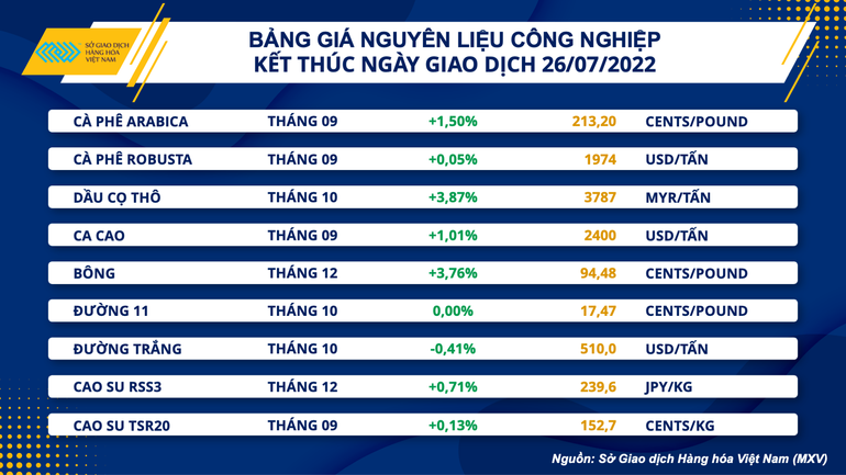 Kết thúc ngày giao dịch 26/7, ngoại trừ 2 mặt hàng đường, lực mua chiếm ưu thế đối với tất cả các mặt hàng còn lại trong nhóm nguyên liệu công nghiệp. Cà-phê và bông đều có phiên tăng thứ 2 trong tuần, cùng với đó, dầu cọ bật tăng sau 3 phiên giảm liên tiếp nhờ tín hiệu nhập khẩu tích cực từ Trung Quốc. Ở hướng ngược lại, đường vẫn chưa có dấu hiệu hồi phục và đang ở mức thấp nhất kể từ cuối tháng 7 năm ngoái.