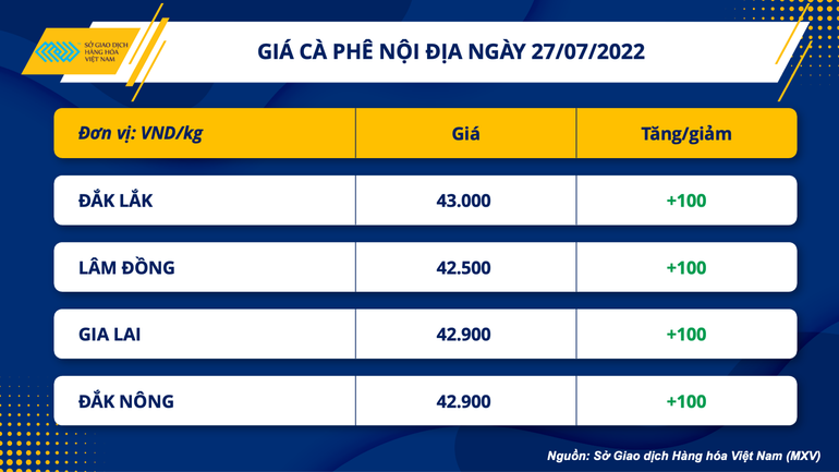 Trên thị trường nội địa, giá cà-phê nhân xô tại Tây Nguyên và các tỉnh Nam Bộ tiếp tục duy trì được đà tăng từ đầu tuần. Ghi nhận trong sáng nay, giá cà-phê thu mua trên toàn quốc đồng loạt điều chỉnh tăng thêm khoảng 100 đồng/kg so với sáng hôm qua, dao động trong khoảng 42.500 - 43.000 đồng/kg.