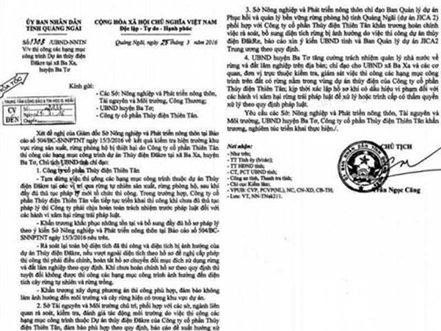 Mặc dù đến thời điểm này, các thủ tục theo quy định của dự án vẫn chưa hoàn tất và việc đền bù cho số hộ có đất rừng vẫn chưa xong... nhưng Thiên Tân Group đã thi công hàng loạt hạng mục, xâm hại cả vào rừng phòng hộ. Vì vậy, ngày 25-3, UBND tỉnh Quảng Ngãi đã có Công văn chỉ đạo Thiên Tân Goup tạm dừng thi công các hạng mục công trình thuộc dự án Thủy điện Đăk Re tại các vị trí qua rừng tự nhiên sản xuất và rừng phòng hộ, sau khi hoàn thành các thủ tục pháp lý theo quy định mới được tiếp tục thi công.