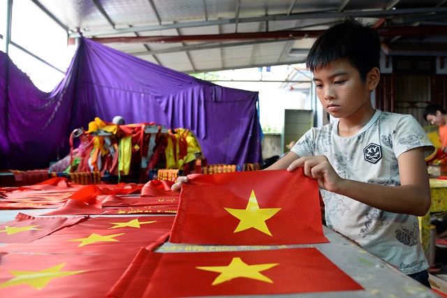 Những ngày này, trẻ em trong gia đình cũng tới xưởng để phụ giúp. Đây là cũng dịp để các em nhỏ có thể hiểu được ý nghĩa của lá cờ Tổ quốc, nhờ đó, càng thêm yêu quê hương, đất nước mình.