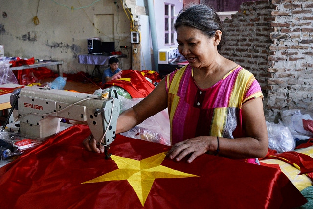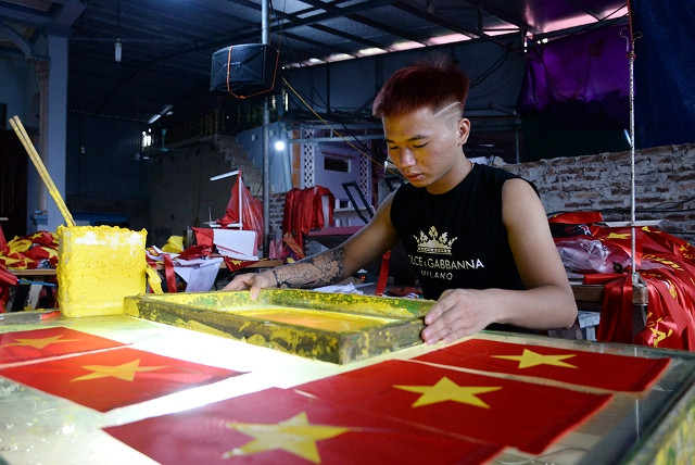 Mỗi năm, hộ gia đình anh Phục xuất ra thị trường hàng trăm nghìn lá cờ Tổ quốc với đủ mọi kích thước. Vào những dịp lễ, Tết, đặc biệt là trong những ngày sát dịp lễ Quốc khánh 2-9, toàn bộ xưởng may phải làm việc gấp rút mới đủ hàng cung ứng ra thị trường.
