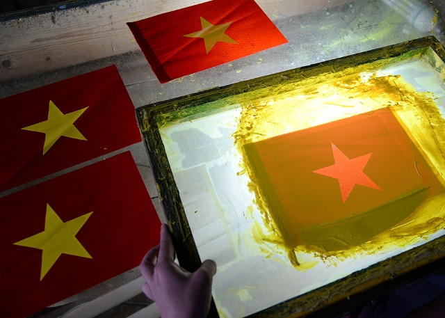 Để hoàn tất được một lá cờ Tổ quốc theo quy định của Nhà nước, người thợ thực hiện từng thao tác một cách chính xác, cẩn trọng.