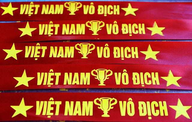 Bên cạnh cờ Tổ quốc, xưởng của nhà anh Phục cũng sản xuất băng-rôn cổ vũ. Những tấm băng-rôn “Việt Nam vô địch” được sản xuất cẩn thận không kém. Đặc biệt hơn nữa, chúng được làm dựa trên hai mầu sắc thiêng liêng của lá cờ Tổ quốc, nền đỏ, chữ vàng.