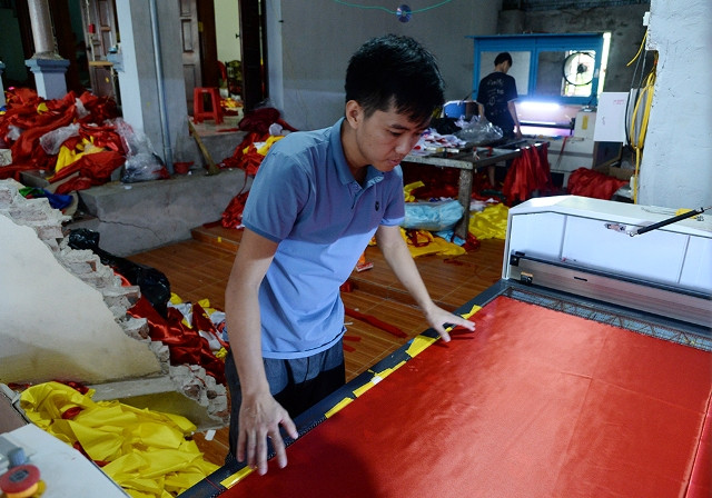 Nhằm nâng cao năng suất, không chỉ gia đình anh Phục mà các hộ dân ở thôn Từ Vân đã áp dụng máy móc hiện đại vào sản xuất, nhờ đó có thể cắt được những lá cờ với kích thước chuẩn trong thời gian ngắn.