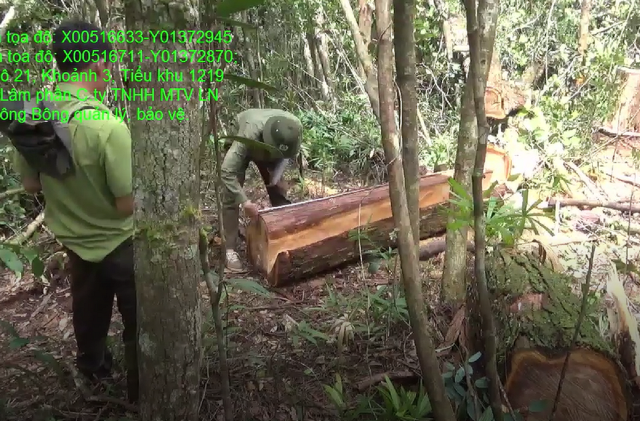 Vị trí các cây gỗ bị khai thác được xác định bằng máy GPS 78s nằm ở lô 5, lô 23, khoảnh 2; lô 8, lô 21 khoảnh 3 tiểu khu 1219 thuộc lâm phần do Công ty Lâm nghiệp Krông Bông quản lý. Dọc từ khoảnh 2 đến khoảnh 3, lâm tặc đã chặt hạ nhiều cây rừng mở một con đường mòn và nhiều đường xương cá, vận chuyển lâm sản ra khỏi rừng bằng gùi, trâu kéo.