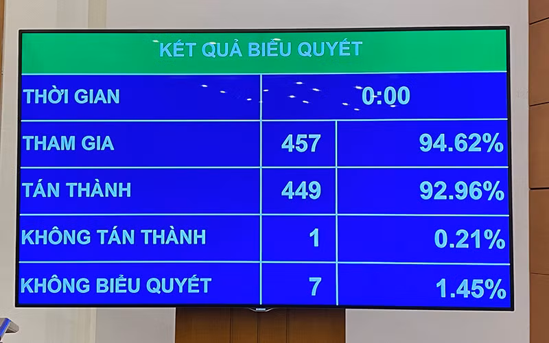 Kết quả biểu quyết thông qua Luật sửa đổi, bổ sung một số điều của Luật Ban hành văn bản quy phạm pháp luật. Ảnh: NGUYÊN MINH.
