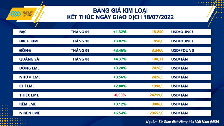 Trên thị trường kim loại, ngoại trừ thiếc LME, các mặt hàng còn lại trong bảng giá kim loại đều bật tăng mạnh mẽ. Bạc đón nhận phiên tăng thứ 2 với mức tăng 1,32%, kết phiên tại mức giá 18,84 USD/ounce. Bạch kim dẫn đầu đà phục hồi của nhóm kim loại khi tăng mạnh mẽ 3%, lấy lại mốc 856 USD/ounce.