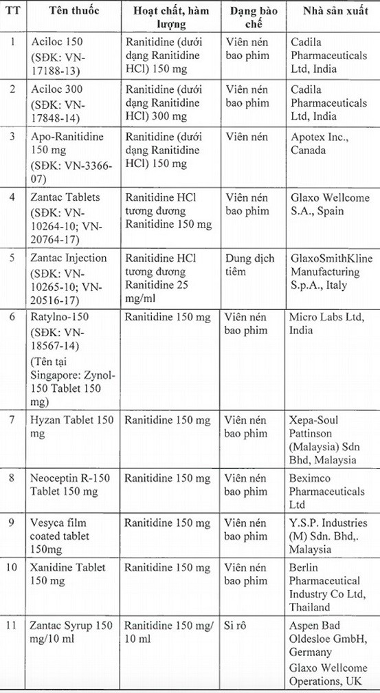 Trong công văn, Cục Quản lý Dược thông tin: Căn cứ thông báo của Cơ quan Khoa học y tế Singapore (HSA), Cơ quan Quản lý dược phẩm Thụy Sĩ (Swissmedic) về việc thu hồi các thuốc chứa Ranitidine do phát hiện chứa tạp chất N-nitrosodimethylamine (NDMA) có nguy cơ gây ung thư ở hàm lượng vượt quá ngưỡng cho phép của quốc tế, Việt Nam cũng tiến hành thu hồi 11 loại thuốc có thành phần Ranitidine. Các thuốc Việt Nam thu hồi đều được sản xuất tại Ấn Độ, Tây Ban Nha, Italia, Anh, Thái-lan, Malaysia có hàm lượng Ranitidine 150 mg/10ml, 150 mg/25 ml và loại 150 mg.
