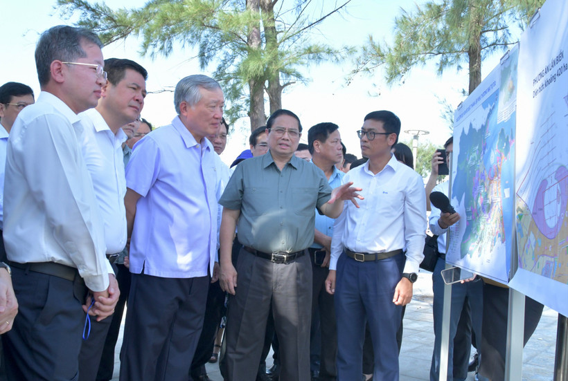 | Thủ tướng Phạm Minh Chính thị sát khu vực đầu tư xây dựng bến cảng Liên Chiểu. (Ảnh: THANH GIANG) |