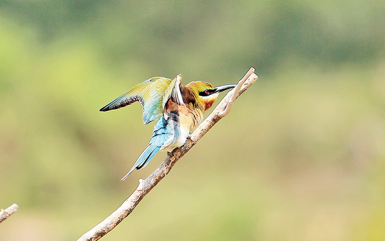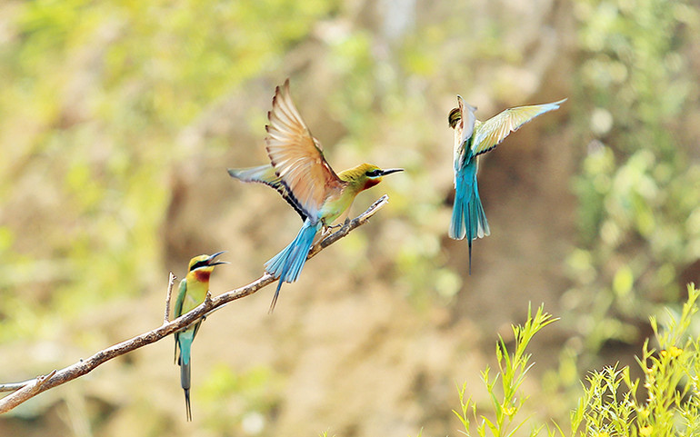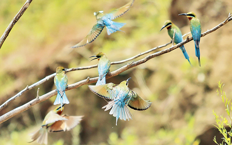 Hành trình chim trảu đuôi xanh tạo ra nơi ở, tìm kiếm con mồi để từ đó bắt cặp không hề đơn giản; chúng thường chọn sinh cảnh sống ở nơi có đủ nguồn thức ăn, vắng vẻ. Những bãi cát ven sông, suối, bãi biển chính là ngôi nhà chung của đàn trảu đuôi xanh. Với chiều dài cơ thể khoảng 30 cm, khi tung cánh, chim trảu đuôi xanh để lộ ra bộ lông rực rỡ sắc mầu. Dưới ánh nắng mặt trời, đôi cánh xòe rộng bay lượn càng thêm ấn tượng. Khoảnh khắc chim mái chờ chim trống tha mồi về, cất tiếng kêu được giới chụp ảnh chim hoang dã trân trọng nhất. Mỗi cặp chim dùng cách rung đuôi để xác định ra bạn tình. Với chú chim trống, bản lĩnh trong môi trường tự nhiên nằm ở cách chúng bảo vệ lãnh thổ và bạn tình của mình.