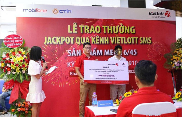 Chiều 13/7, Chi nhánh Khánh Hòa (thuộc Vietlott) thực hiện lễ trao giải Jackpot sản phẩm xổ số tự chọn Mega 6/45 kỳ QSMT số 910 đến anh T. - thuê bao Mobifone may mắn đến từ tỉnh Bình Định với tổng giá trị 66.844.435.000 đồng (chưa khấu trừ thuế thu nhập cá nhân theo quy định nhà nước). Sau gần 2 năm triển khai kênh điện thoại Vietlott SMS, đây là thuê bao trúng lớn nhất.