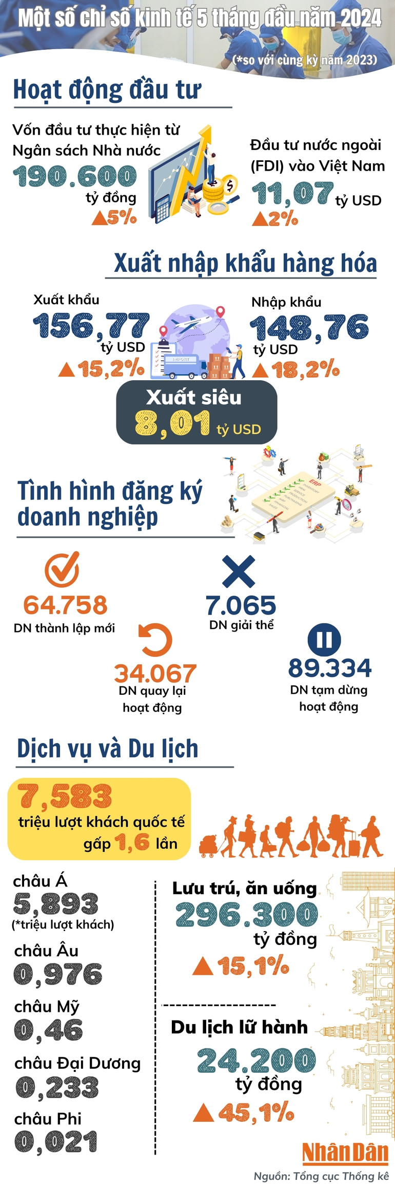 Theo số liệu được Tổng cục Thống kê công bố ngày 29/5, nền kinh tế trong 5 tháng đầu năm tiếp tục ghi nhận những tín hiệu tích cực, đặc biệt là kim ngạch xuất khẩu hàng hóa ước đạt 156,77 tỷ USD, tăng 15,2% so cùng kỳ năm trước, và vốn FDI đăng ký vượt mốc 11 tỷ USD.