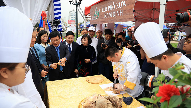 | Các nghệ nhân đang chuẩn bị phở cho đại biểu và khách tham quan. |