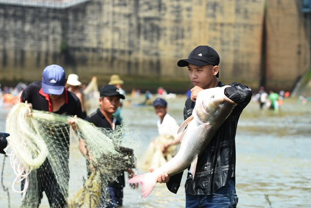 Sau khi thủy điện ngưng xả, rất đông người dân đã đến khu vực đập thủy điện để đánh bắt cá.