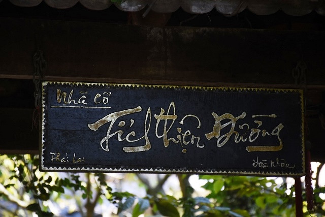 Nhà cổ Tích Thiện Đường nằm bình yên giữa một vườn cây xanh đầy hoa trái, chim bồ câu và tình người. Những cây cột gỗ đã lên nước bóng mầu thời gian, những nét chạm, trổ tài ba. Ở gian giữa có bức hoành phi với ba chữ Hán đại tự: Tích Thiện Đường, mang ý nghĩa răn dạy con cháu phải biết tích đức, làm điều thiện, sống nhân hậu với cuộc đời.