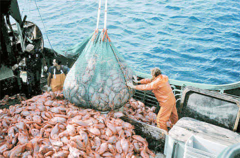 Cá orange roughy bị đánh bắt hàng loạt bằng tàu đánh cá lưới rà, dẫn đếnsuy giảm số lượng nghiêm trọng.