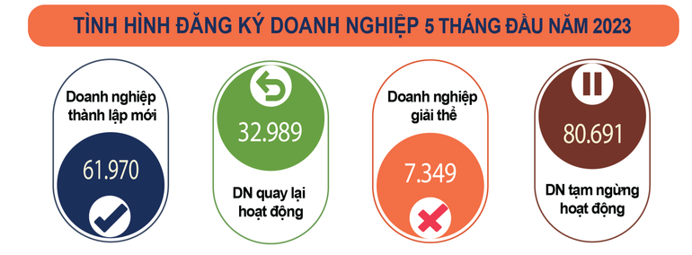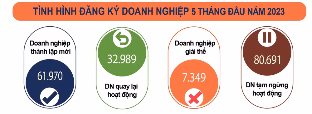 Số liệu vừa được Tổng cục Thống kê (Bộ Kế hoạch và Đầu tư) cho thấy: trong năm tháng đầu năm 2023, cả nước có 95 nghìn doanh nghiệp đăng ký thành lập mới và quay trở lại hoạt động, giảm 3,7% so cùng kỳ năm trước; bình quân một tháng có 19 nghìn doanh nghiệp thành lập mới và quay trở lại hoạt động. Tuy nhiên, số doanh nghiệp rút lui khỏi thị trường lên tới 88 nghìn doanh nghiệp, tăng 22,6% so cùng kỳ năm trước.
