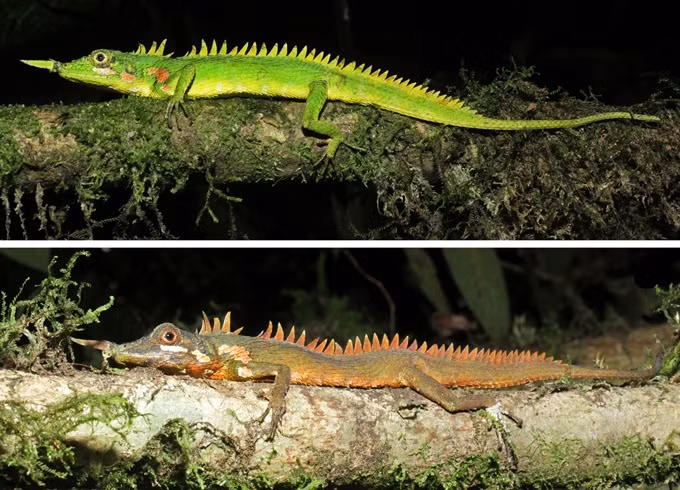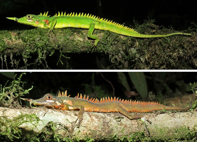 Thằn lằn có sừng ở mũi thường có màu xanh lá cây và màu vàng sáng (ảnh trên), nhưng chuyển sang màu nâu cam khi bị căng thẳng (ảnh dưới). Ảnh: C.A.Putra