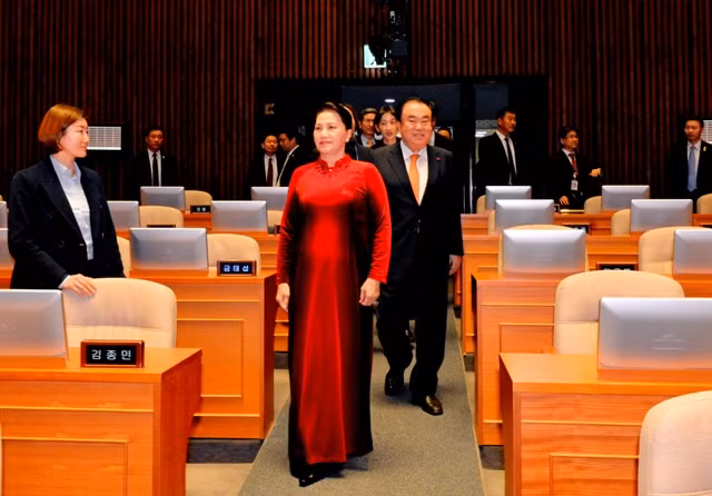 Chủ tịch Quốc hội Hàn Quốc Moon Hee Sang nhiệt liệt chào mừng Chủ tịch Quốc hội Nguyễn Thị Kim Ngân dẫn đầu Đoàn đại biểu cấp cao Quốc hội Việt Nam thăm chính thức Hàn Quốc.