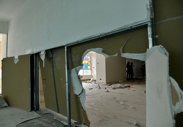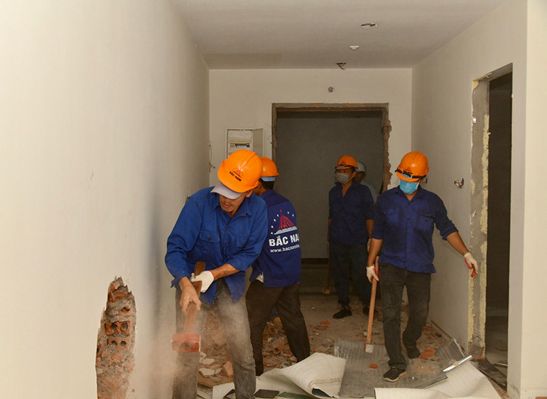 Trong sáng 16-5, công nhân đơn vị tháo dỡ (Công ty CP đầu tư xây dựng dân dụng Bắc Nam) tiến hành phá các bức tường ngăn: