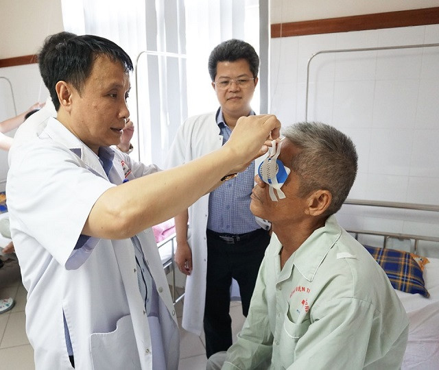 GS, TS Phạm Như Hiệp, Giám đốc Bệnh viện Trung ương Huế trực tiếp bóc băng mắt cho bệnh nhân Phan Hữu Lạc.
