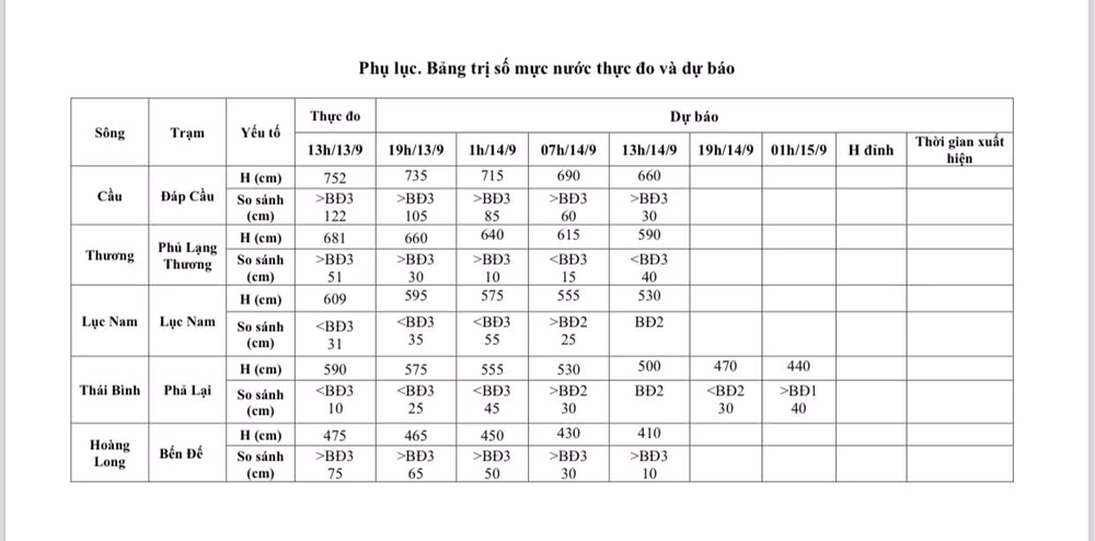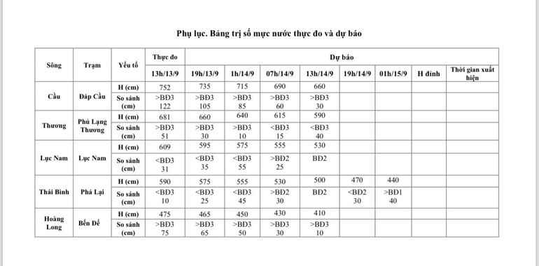 Mực nước lúc 13 giờ ngày 13/9, trên các sông như sau: