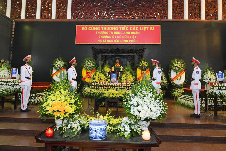 Phía bên trong Nhà tang lễ quốc gia là tấm biển ghi dòng chữ: "Vô cùng thương tiếc các liệt sĩ: Thượng tá Đặng Anh Quân, Thượng uý Đỗ Đức Việt, Hạ sĩ Nguyễn Đình Phúc". Chung quanh ban thờ chung là các vòng hoa vàng, trắng đan xen. Linh cữu của 3 Liệt sĩ được phủ quốc kỳ.