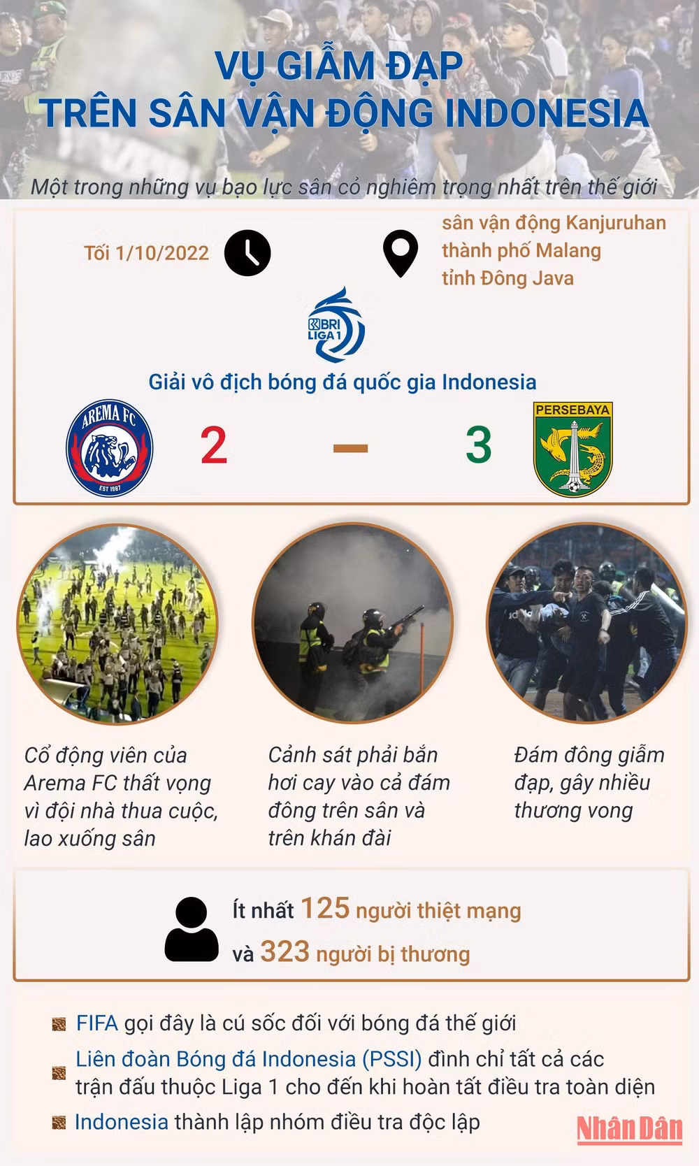 Một trong những thảm kịch kinh hoàng nhất trong lịch sử bóng đá thế giới đã xảy ra trên sân vận động tại tỉnh Đông Java, Indonesia, ngày 1/10/2022. Nhiều cổ động viên quá khích đã tràn xuống sân bóng, dẫn đến vụ giẫm đạp khiến hàng trăm người thương vong.