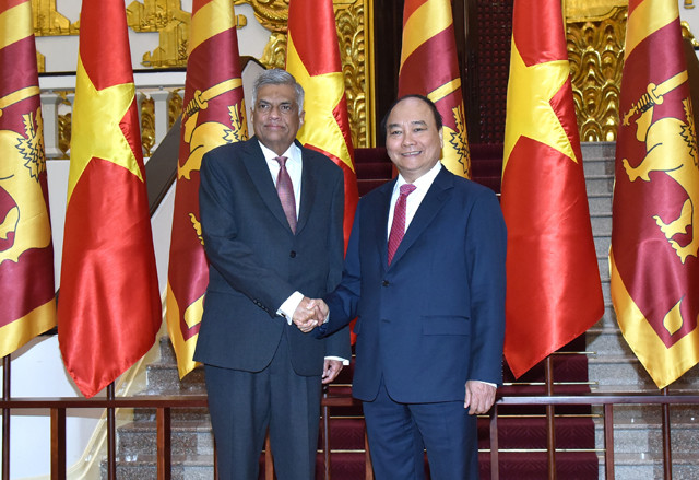 Thủ tướng Nguyễn Xuân Phúc với Thủ tướng Xri Lan-ca R.Uých-rê-mê-xinh-hê. Ảnh: ĐĂNG KHOA