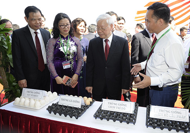 Tổng Bí thư Nguyễn Phú Trọng tham quan các gian trưng bày sản phẩm nông nghiệp tại Học viện Nông nghiệp Việt Nam.