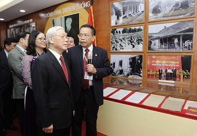 Tổng Bí thư Nguyễn Phú Trọng thăm Phòng truyến thống của Học viện Nông nghiệp Việt Nam.