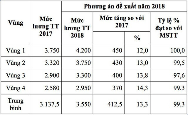 Đại diện Tổng LĐLĐ Việt Nam lý giải, việc đề xuất tăng mức lương tối thiểu vùng năm 2018 lên bình quân 13,3% dựa trên những căn cứ và kết quả khảo sát nhất định. Đó là, hiện mức sống của người lao động rất khó khăn, trong khi nhìn lại, nền kinh tế năm 2017 đã có nhiều điểm sáng, số doanh nghiệp thành lập mới nhiều hơn so với số doanh nghiệp phá sản, tỷ lệ thất nghiệp giảm hơn so năm 2016, GDP tăng 6%... đây là cơ sở để Tổng LĐLĐ Việt Nam đề nghị mức tăng bình quân 13,3% lương tối thiểu vùng 2018.