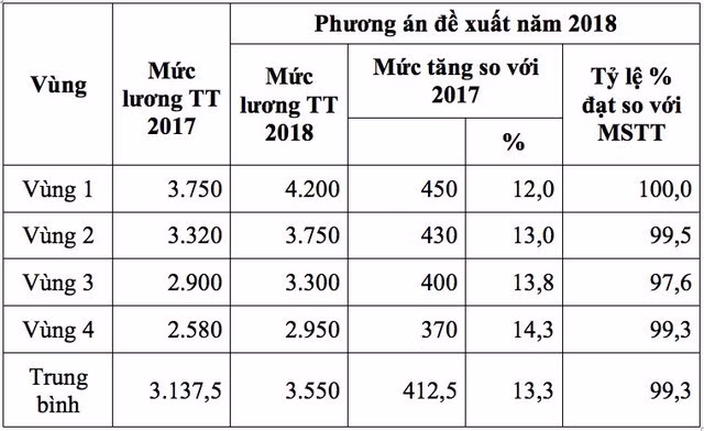 Phương án 1: Điều chỉnh bù mức tăng CPI (4%) và tăng thêm 1% theo mức tăng năng suất lao động. Theo đó, lương tối thiểu 2018 tăng từ 130.000 - 180.000 đồng, trung bình là 5%.