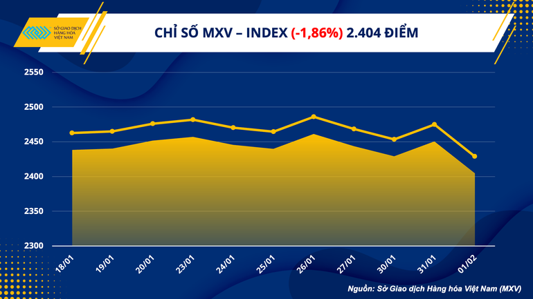 Điều này đã kéo chỉ số MXV-Index giảm mạnh gần 2% xuống 2.404 điểm, thấp nhất trong 3 tuần trở lại đây. Nhà đầu tư trong nước cũng tỏ ra rất thận trọng trong ngày thị trường biến động mạnh. Giá trị giao dịch toàn Sở đạt mức 2.500 tỷ đồng.