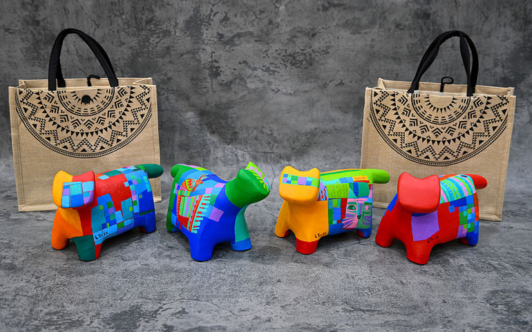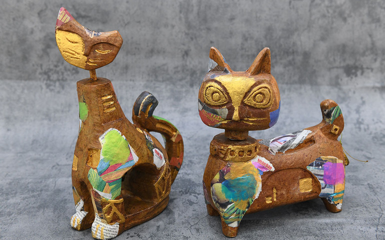 Còn hai họa sĩ Lê Thiết Cương và Lê Minh Trí lại mang đến triển lãm các tác phẩm điêu khắc màu được sáng tạo trên nền phôi gỗ xà cừ, với lớp báo cũ được bồi dán rồi sau đó phủ màu, vẽ tranh bằng chất liệu acrylic. Trên bề mặt mỗi tác phẩm mèo đôi khi là những bức tranh tối giản đem đến sự độc đáo và thú vị.