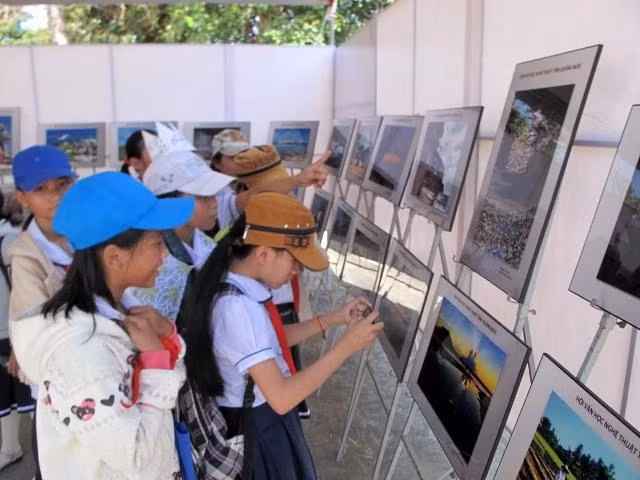 Các em học sinh xem triển lãm ảnh về biển đảo