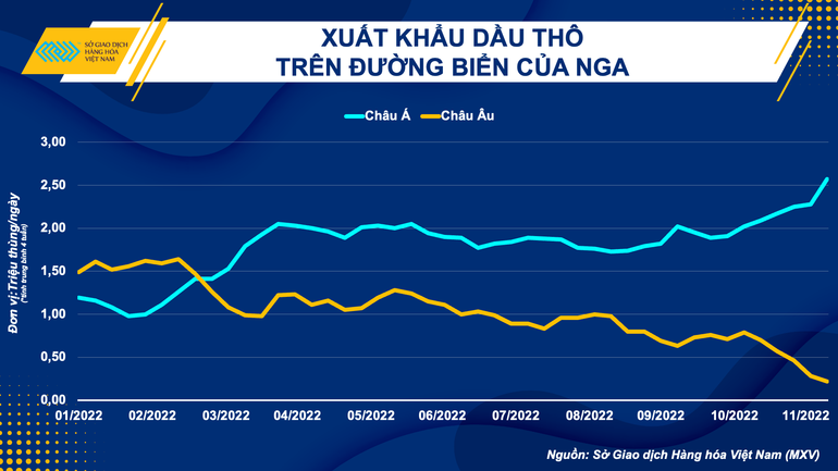Cụ thể, theo Bloomberg, xuất khẩu dầu thô trên biển trung bình trong 4 tuần của Nga sang các nước châu Âu đã giảm xuống còn 215.000 thùng/ngày tính đến ngày 9/12. Trái lại, khối lượng dầu thô sang châu Á, cùng với những chuyến hàng trên các tàu không có điểm đến cuối cùng, thường kết thúc ở Ấn Độ hoặc Trung Quốc, đã tăng lên hơn 2,5 triệu thùng mỗi ngày.