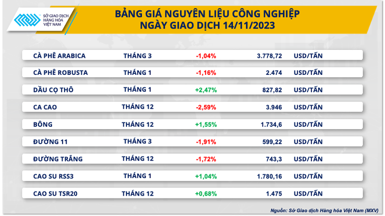 Trong một diễn biến đáng chú ý khác, giá cà-phê giảm lần lượt 1,04% với Arabica và 1,16% với Robusta. Theo MXV, những tín hiệu tích cực hơn từ nguồn cung, kết hợp cùng tín hiệu đảo chiều từ yếu tố kỹ thuật đã gây sức ép lên giá.