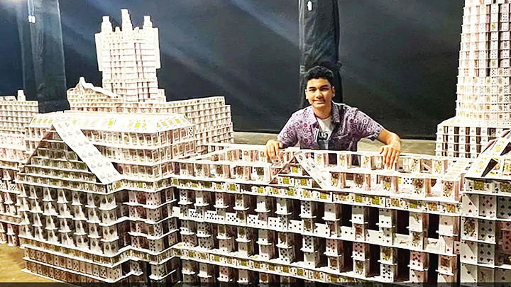 Arnav Daga, một học sinh Ấn Độ 15 tuổi, đã mất 41 ngày để xếp các lá bài mô phỏng bốn công trình kiến trúc nổi tiếng ở thành phố Kolkata (trong ảnh). Theo NDTV, Daga đã sử dụng khoảng 143.000 lá bài để xếp thành bản sao các điểm du lịch nổi tiếng gồm tòa nhà trụ sở hội nhà văn, tượng đài, sân vận động và nhà thờ.