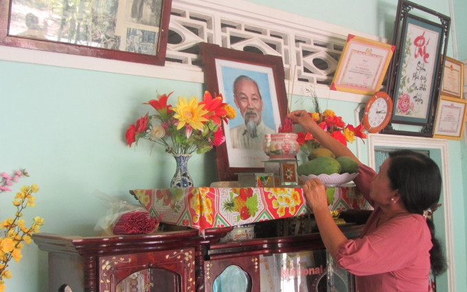 Chị Linh, vợ anh Phan Văn Nam (nhân vật trong bài) ngày ngày thắp hương tưởng nhớ Bác.