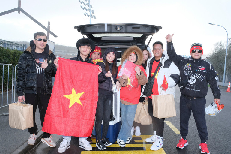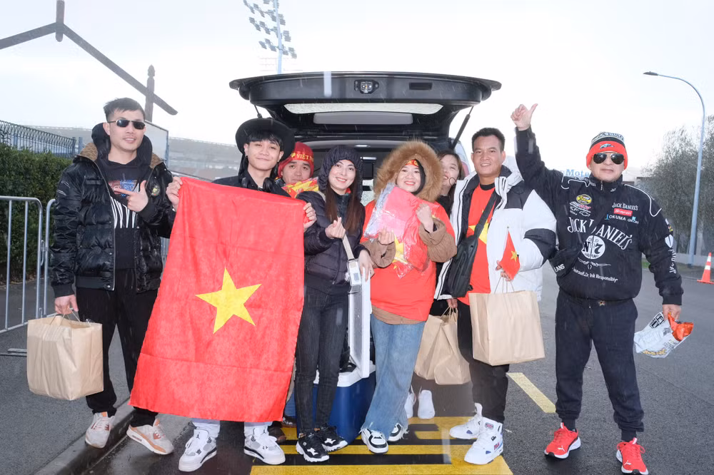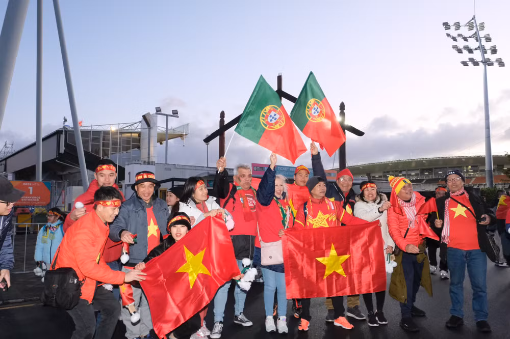 Sau màn chào cờ trang nghiêm, người hâm mộ đội tuyển Việt Nam hô vang "Việt Nam, Việt Nam", niềm tự hào tràn ngập khán đài sân vận động Waikato.
