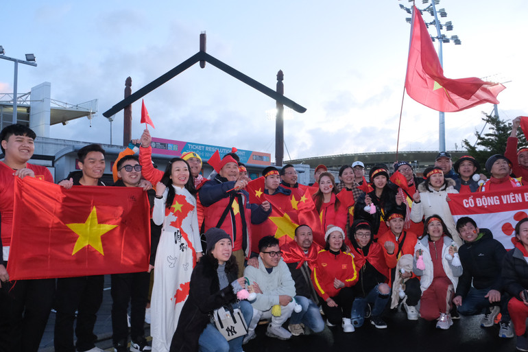 Trước giờ bóng lăn giữa đội tuyển nữ Việt Nam và đội tuyển nữ Bồ Đào Nha, rất đông các cổ động viên cùng bầu không khí sôi động đã diễn ra ngoài sân vận động Waikato (New Zealand).