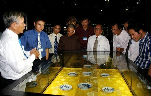 Nhà sưu tập Đoàn Phước Thuận (bên trái) giới thiệu với quan khách về bộ sưu tập đĩa sứ ký kiểu thời Tự Đức.
