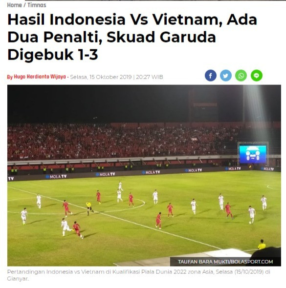 Sau khi Tiến Linh nâng tỷ số lên 3-0 ở phút 61, những nỗ lực của Indonesia chỉ đem về cho họ bàn gỡ danh dự từ pha lập công của cầu thủ vào sân thay người Irfan Bachdim phút 84. Chung cuộc, tuyển Việt Nam khép lại trận đấu với tỷ số 3-1. Bola Sport cũng phải công nhận đây là kết quả thể hiện sự xuất sắc của đội khách, còn Indonesia đã may mắn không để thua thêm bởi Hùng Dũng không thể đánh bại thủ thành Muhammad Ridho trong quả penalty thứ hai đúng vào phút bù giờ cuối cùng của trận đấu. “Với kết quả này, Indonesia tiếp tục nới rộng thành tích toàn thua tệ hại của mình trong bốn trận gần nhất ở vòng loại World Cup 2022”, cây bút của Bola Sport chua chát viết.