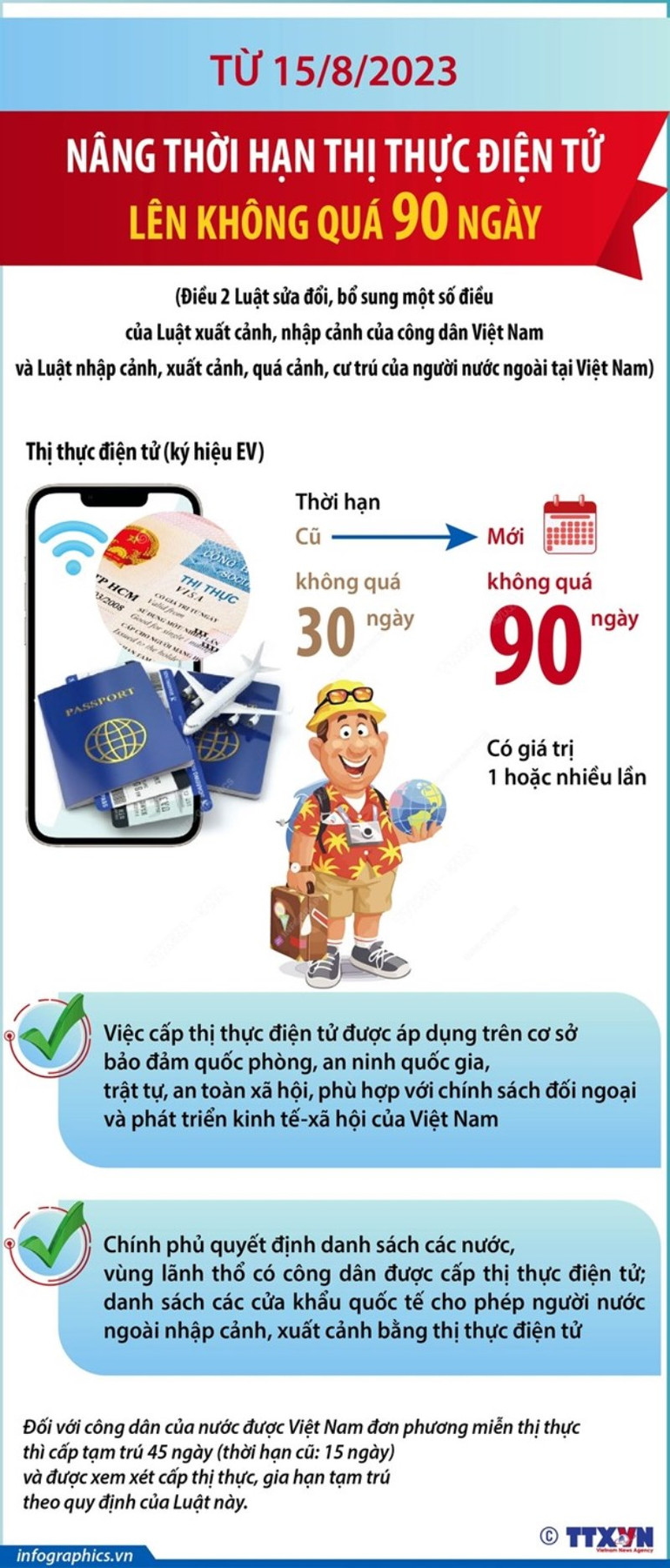 Theo Điều 2 Luật sửa đổi, bổ sung một số điều của Luật Xuất cảnh, Nhập cảnh của Công dân Việt Nam và Luật Nhập cảnh, Xuất cảnh, Quá cảnh, Cư trú của Người nước ngoài tại Việt Nam, từ ngày 15/8/2023, thời hạn thị thực điện tử (hay visa điện tử, ký hiệu EV) được nâng lên từ không quá 30 ngày thành không quá 90 ngày và có giá trị 1 lần hoặc nhiều lần.