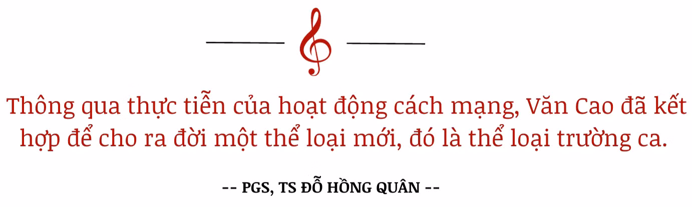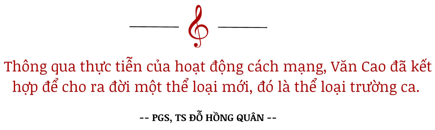 Thông qua thực tiễn của hoạt động cách mạng, Văn Cao đã kết hợp để cho ra đời một thể loại mới, đó là thể loại trường ca. Trường ca là một thể loại âm nhạc có lời, gồm nhiều đoạn, nhiều khúc tương phản về tính chất âm nhạc, tập trung vào một hình tượng chủ đề hoặc một nội dung, một nhân vật cụ thể.